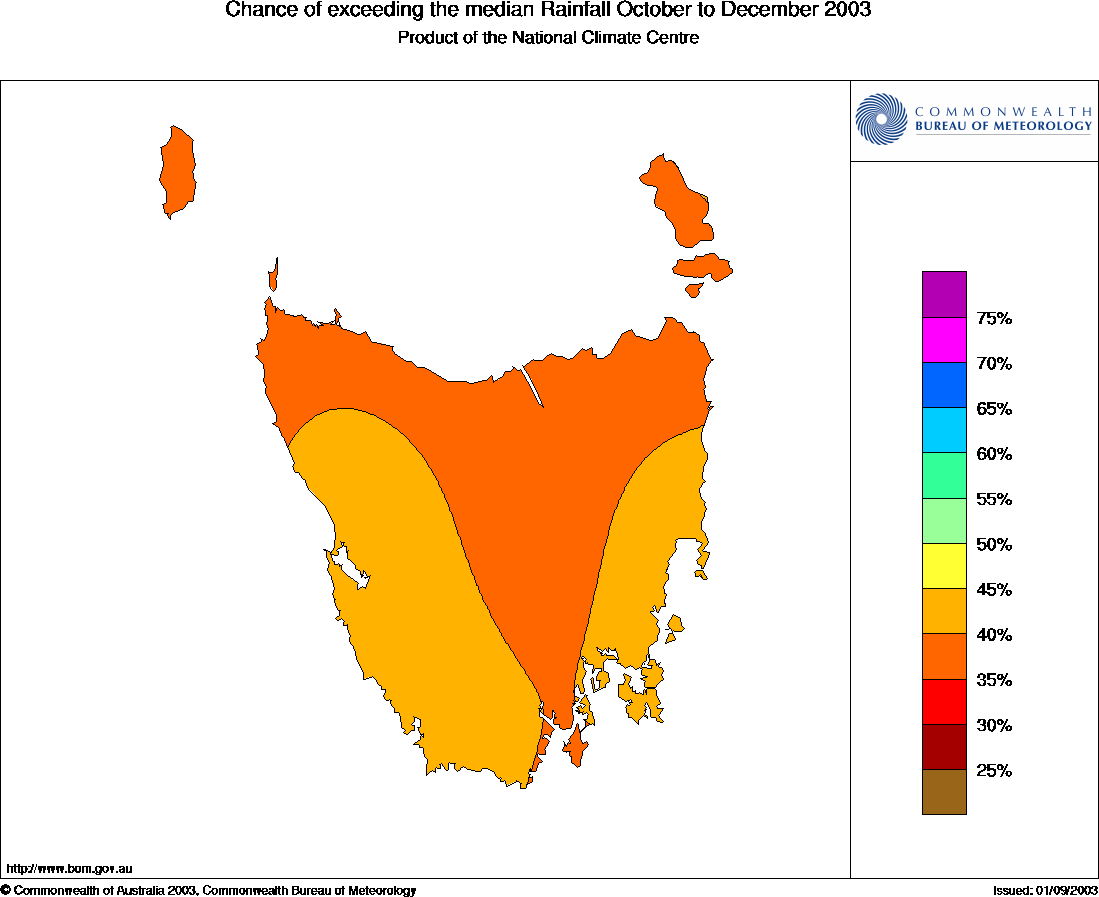 In remaining parts of Tasmania, the chances are between 40 and 45%.