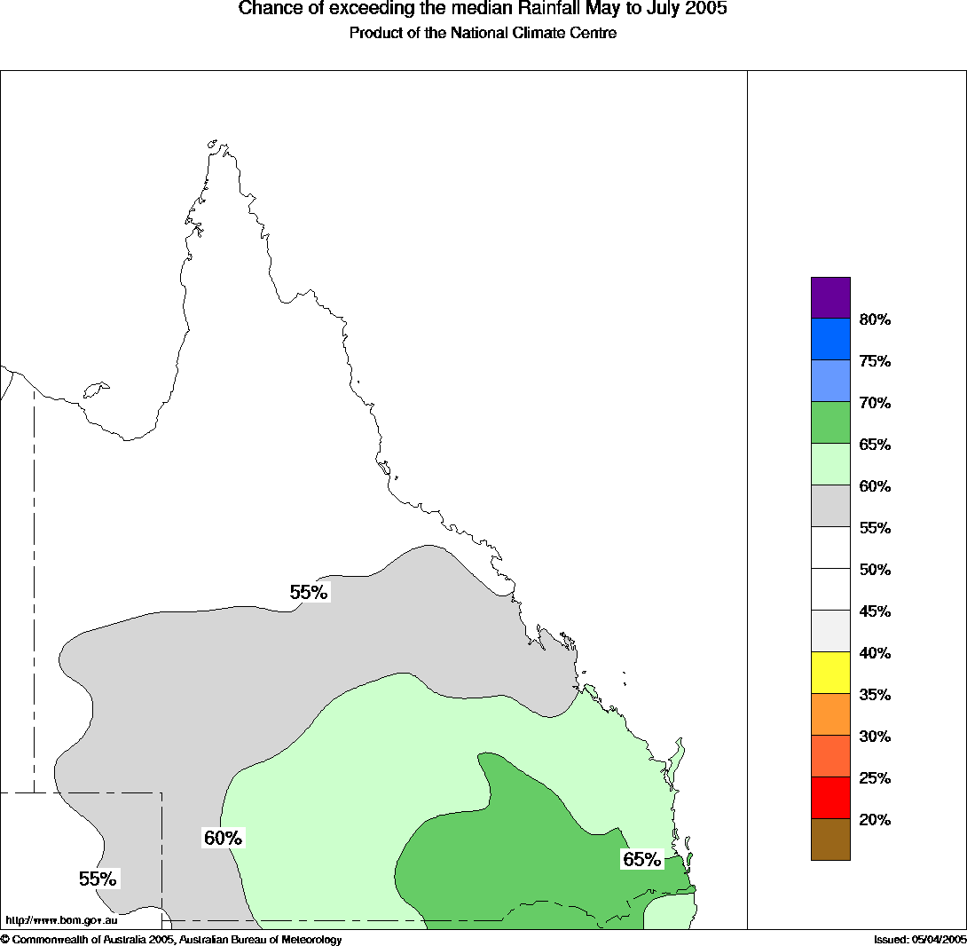 Qld Seasonal Rainfall Outlook: probabilities for May to July 2005, issued 15th April 2005 | |