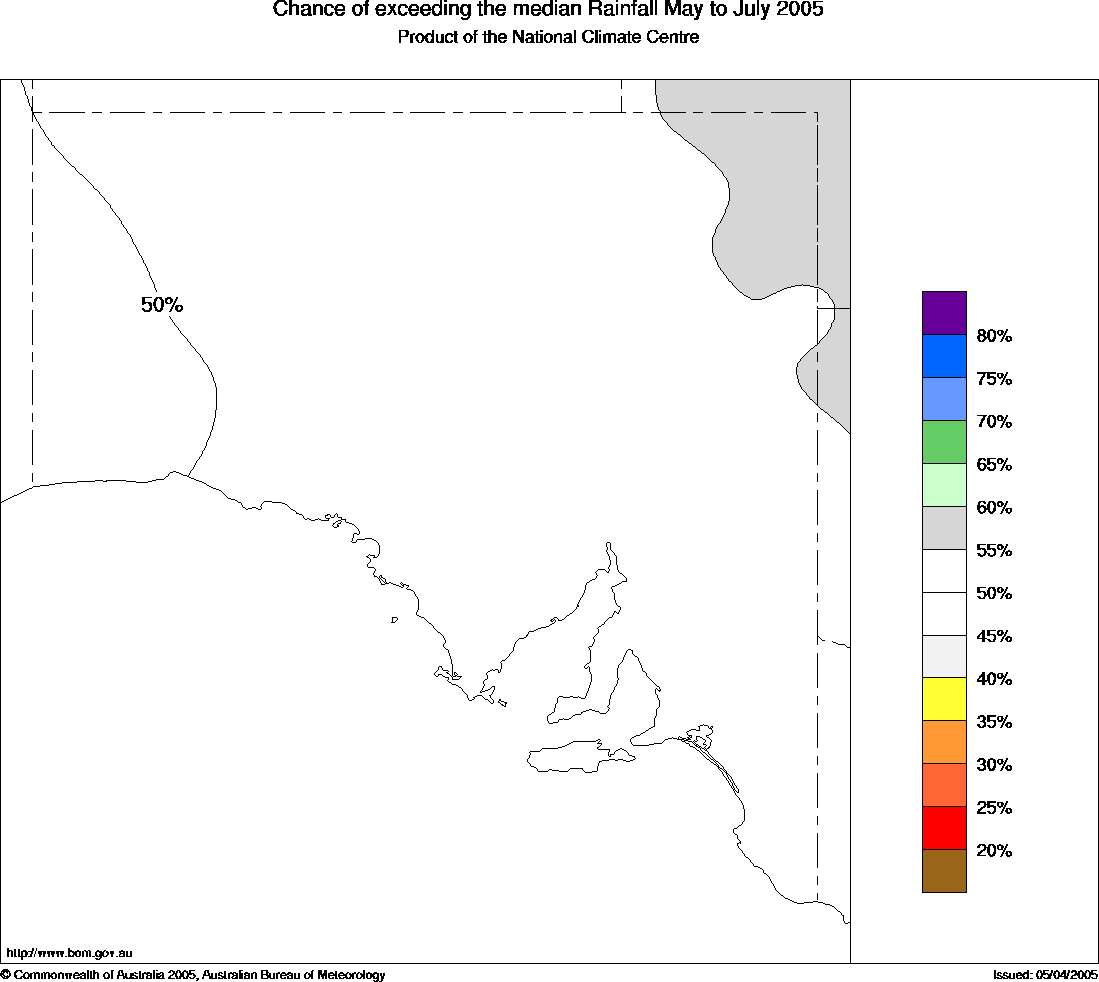 SA Seasonal Rainfall Outlook: probabilities for May to July 2005, issued 15th April 2005 | |