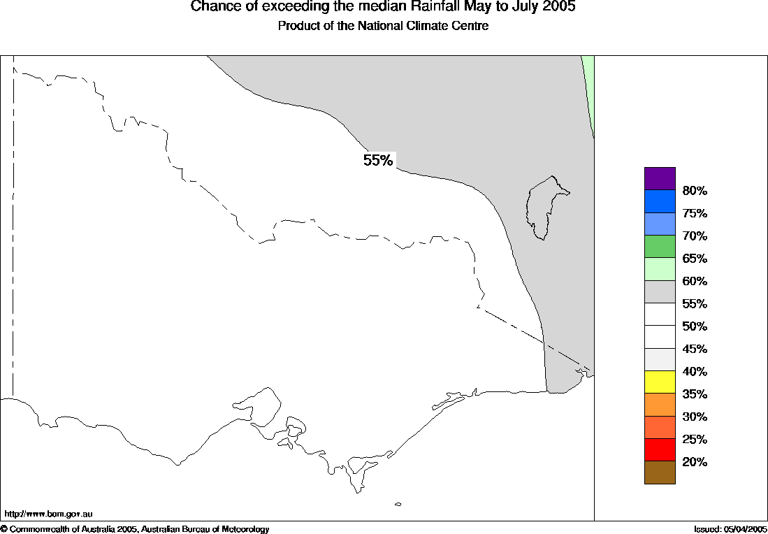 Vic Seasonal Rainfall Outlook: probabilities for May to July 2005, issued 15th April 2005 | |