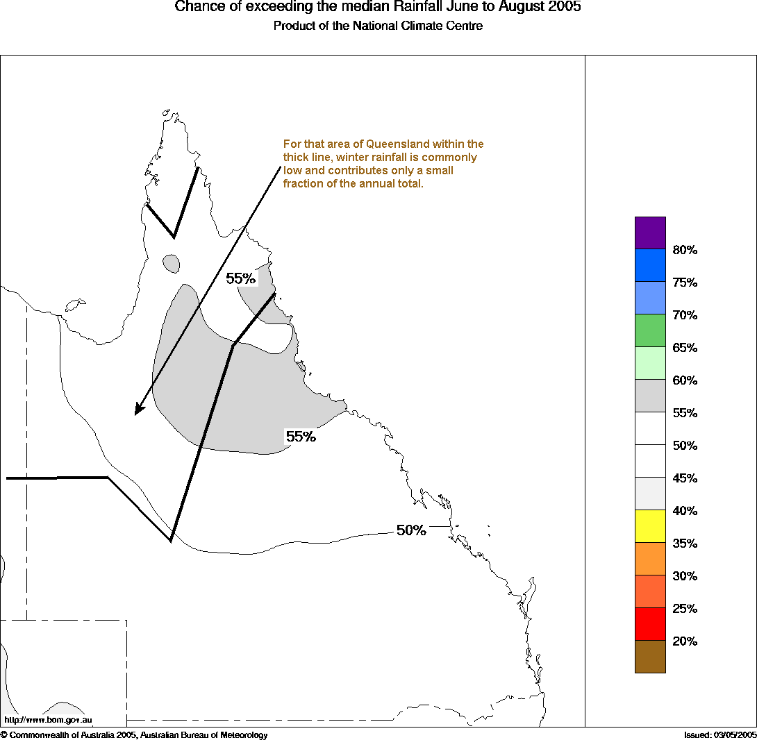 Qld Seasonal Rainfall Outlook: probabilities for Winter 2005, issued 17th May 2005 | |