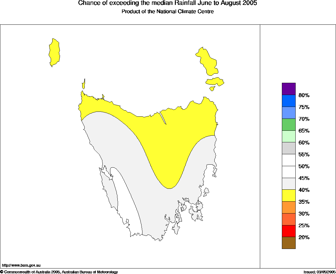 Tas Seasonal Rainfall Outlook: probabilities for Winter 2005, issued 17th May 2005 | |