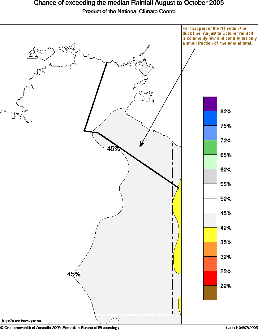 NT Seasonal Rainfall Outlook: probabilities for August to October 2005, issued 14th July 2005 | |