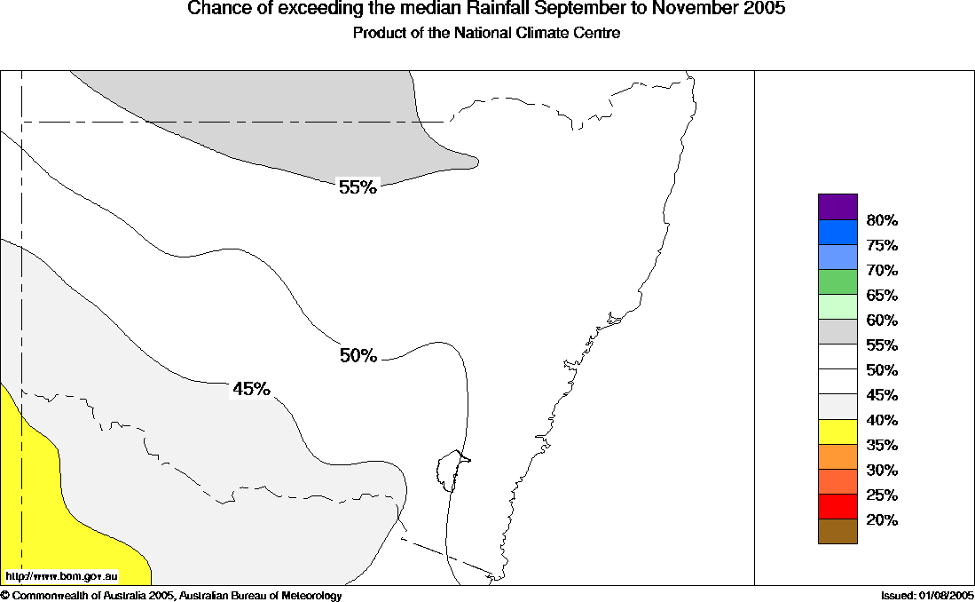 NSW Seasonal Rainfall Outlook: probabilities for Spring 2005, issued 16th August 2005 | |
