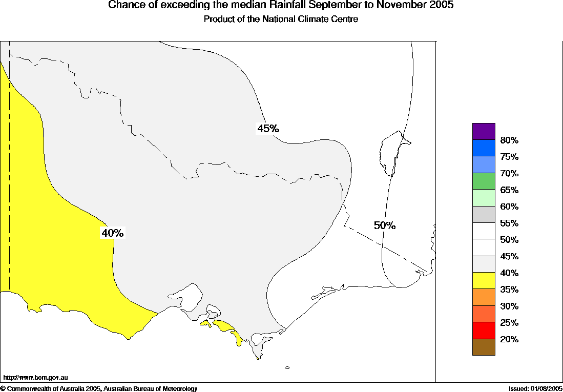 Vic Seasonal Rainfall Outlook: probabilities for Spring 2005, issued 16th August 2005 | |
