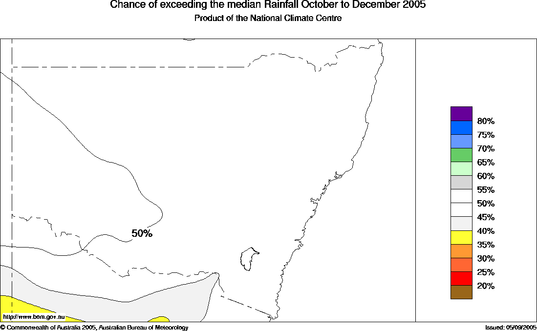 NSW Seasonal Rainfall Outlook: probabilities for October to December 2005, issued 15th September 2005 | |