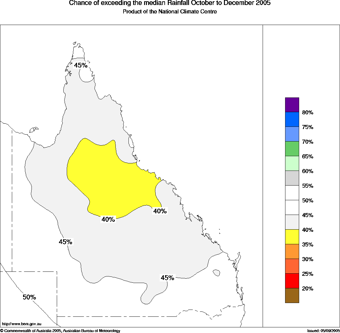 Qld Seasonal Rainfall Outlook: probabilities for October to December 2005, issued 15th September 2005 | |