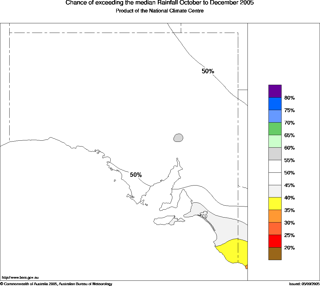 Odds generally 50:50 for a wetter than average season in SAThe odds for a wetter than average December quarter (October to December) are close to 50:50 over most of South Australia, the Bureau of Meteorology announced today. However, in the far southeast of the State the odds have swung in favour of the three-month rainfall total being below the median. ![]() For the October to December period, the chances of above median rainfall are between 35 and 40% in the far southeast of SA (see map). This area has been suffering severe short-term rainfall deficiencies since the start of autumn. See the Drought Statement for more information. So in years with ocean patterns like the current, about four December quarters out of ten are expected to be wetter than the median over this part of South Australia, with about six out of ten being drier. Outlook confidence is related to the influence of Pacific and Indian Ocean temperatures on seasonal rainfall. During the December quarter, history shows this influence to be moderately consistent across the eastern half of SA, but only weakly consistent in the west (see background information). The Southern Oscillation Index (SOI) fell from +1 in July to −7 in August. However, the SOI has begun to rise again with the approximate value for the 30 days ending 12th September being −1. With all the main tropical Pacific climate indicators remaining neutral, an El Niño event developing in 2005 is not considered a realistic possibility. For routine updates and comprehensive discussion on the latest data relating to El Niño, together with details on what the phenomenon is and how it has affected Australia in the past, see the ENSO Wrap-Up. | |