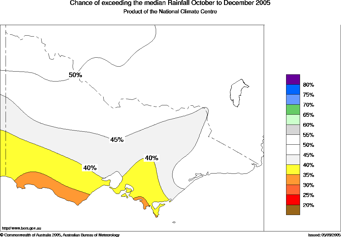 Vic Seasonal Rainfall Outlook: probabilities for October to December 2005, issued 15th September 2005 | |
