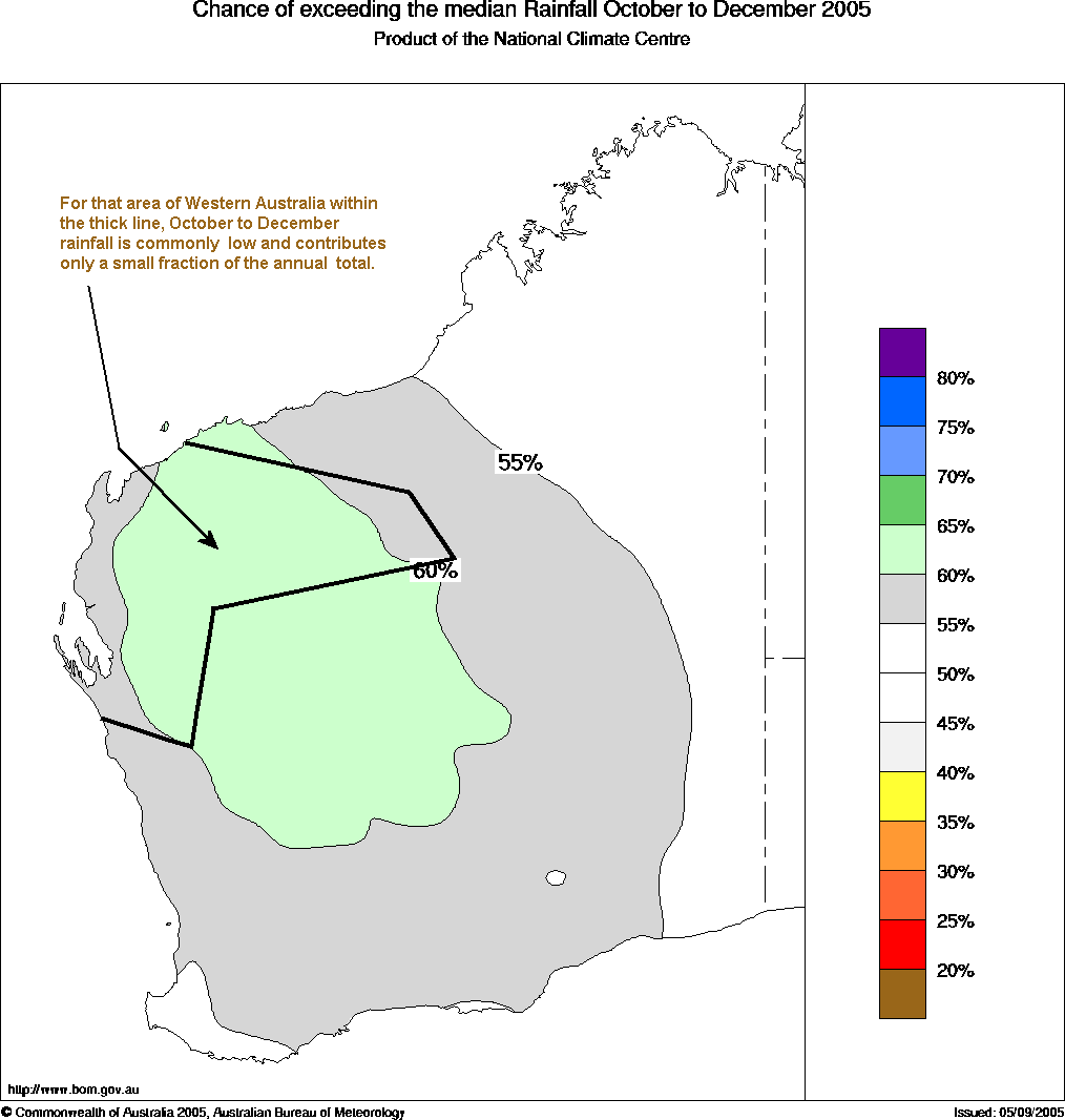 WA Seasonal Rainfall Outlook: probabilities for October to December 2005, issued 15th September 2005 | |