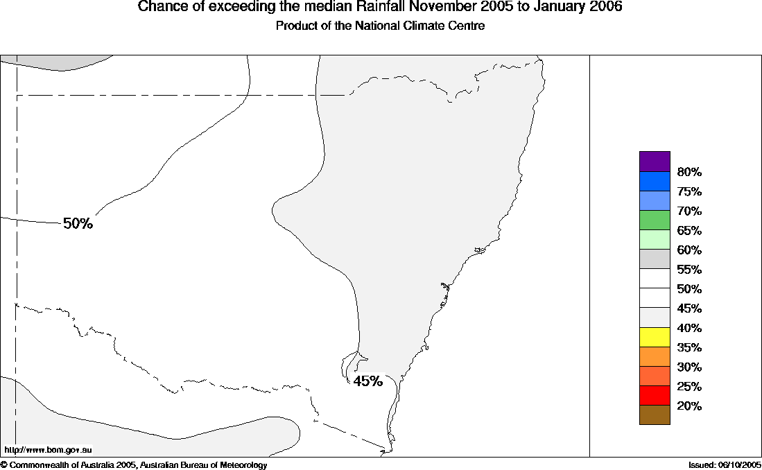 NSW Seasonal Rainfall Outlook: probabilities for November 2005 to January 2006, issued 18th October 2005 | |