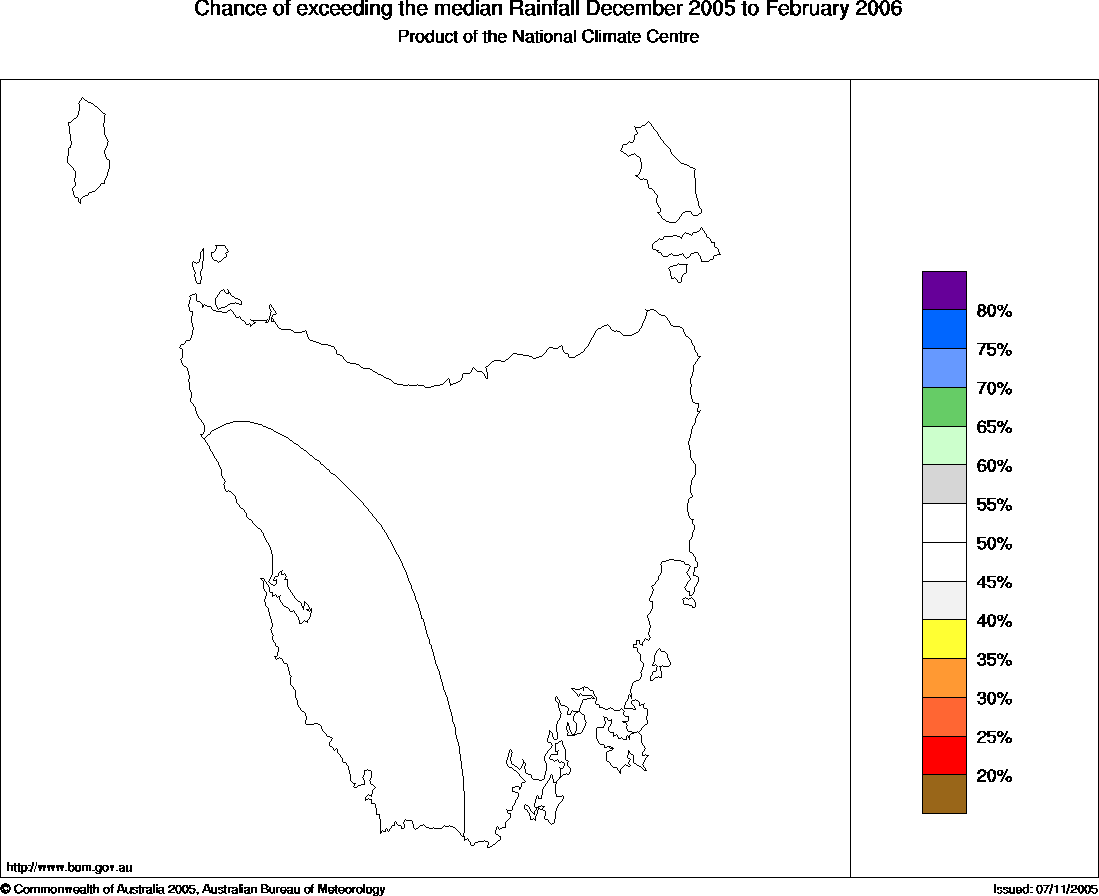 Tas Seasonal Rainfall Outlook: probabilities for Summer 2005/2006, issued 16th November 2005 | |