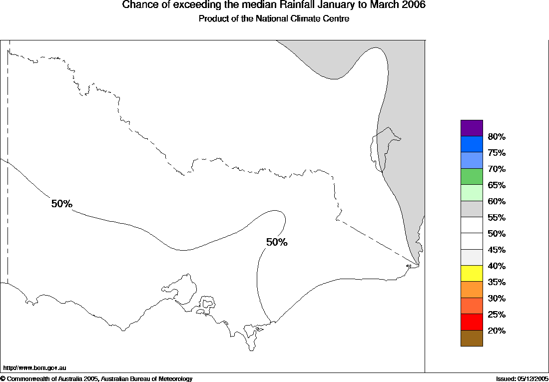 Vic Seasonal Rainfall Outlook: probabilities for January to March 2006, issued 19th December 2005 | |
