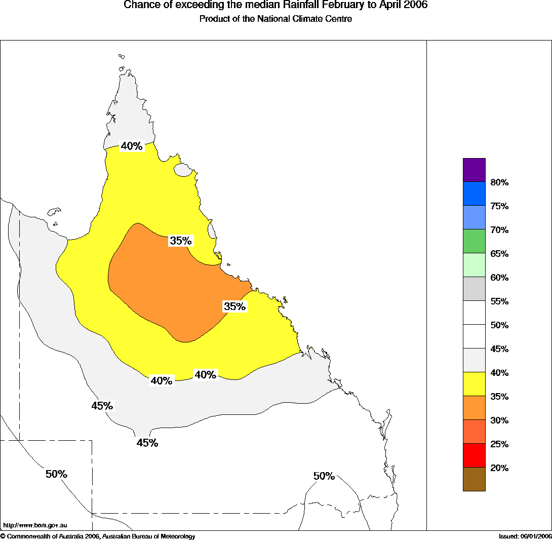 Qld Seasonal Rainfall Outlook: probabilities for February to April 2006, issued 24th January 2006 | |