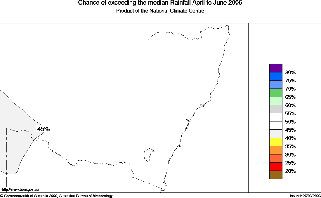 NSW Seasonal Rainfall Outlook: probabilities for April to June 2006, issued 23rd March 2006 | |
