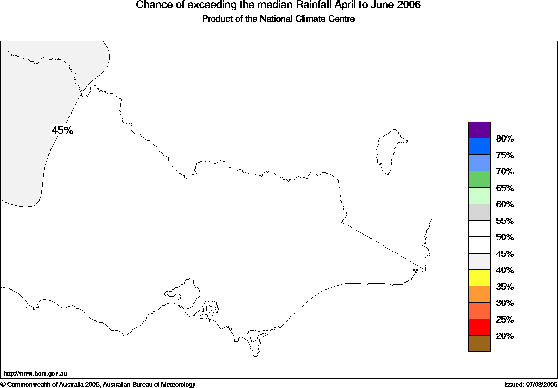 Vic Seasonal Rainfall Outlook: probabilities for April to June 2006, issued 23rd March 2006 | |