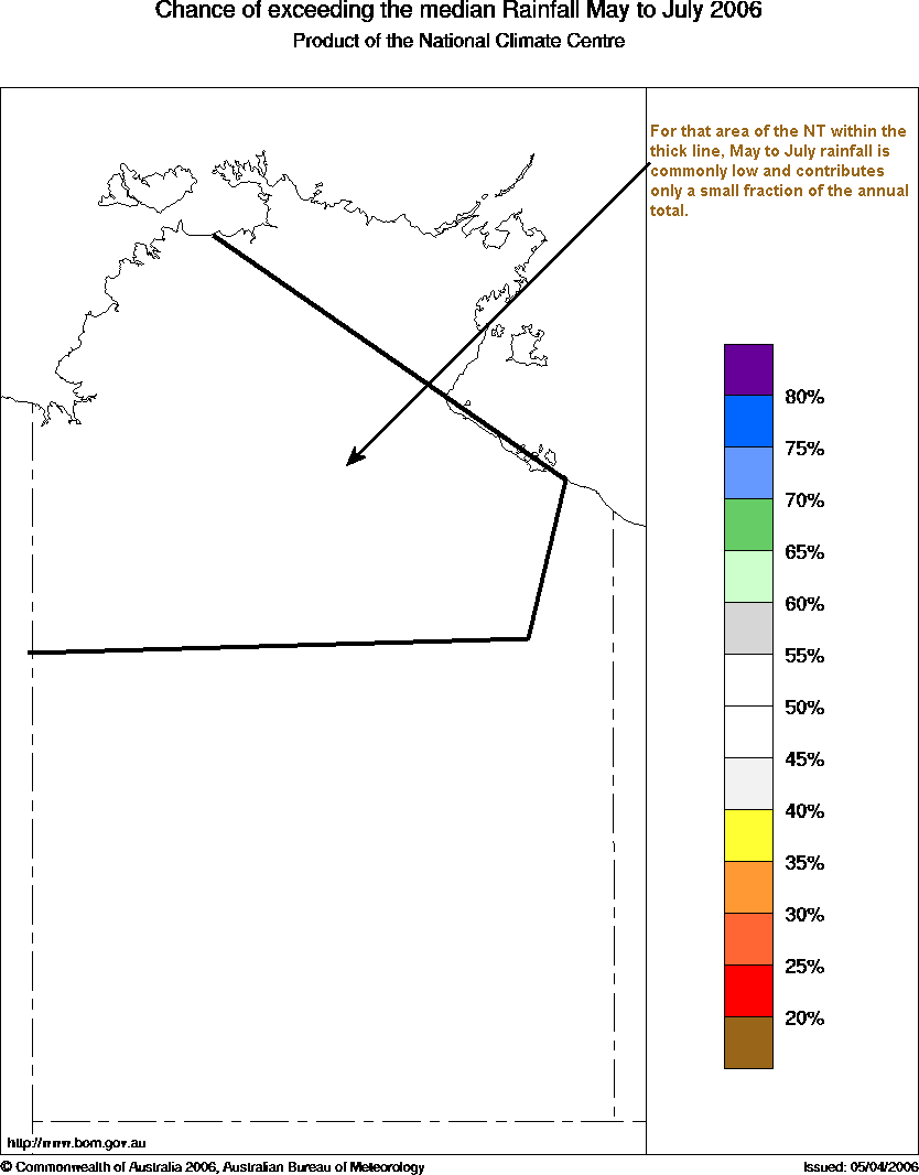 NT Seasonal Rainfall Outlook: probabilities for May to July 2006, issued 21st April 2006 | |