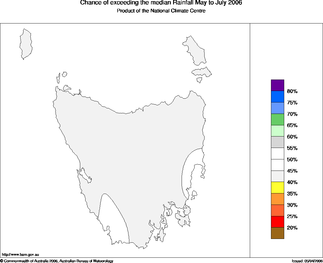 Tas Seasonal Rainfall Outlook: probabilities for May to July 2006, issued 21st April 2006 | |