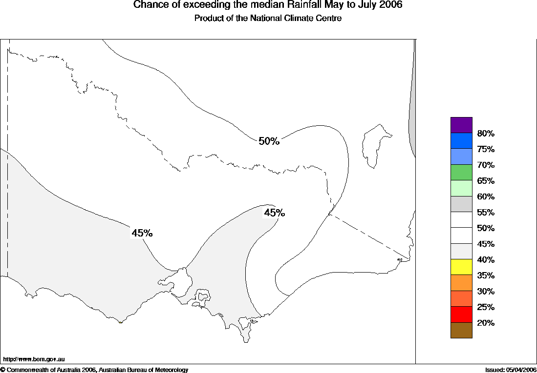 Vic Seasonal Rainfall Outlook: probabilities for May to July 2006, issued 21st April 2006 | |