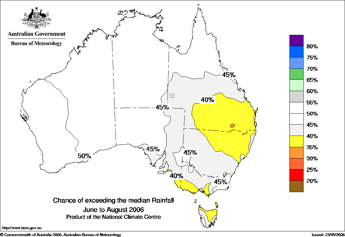 Reduced winter rainfall favoured in parts of eastern AustraliaThere is a moderate shift in the odds towards below average winter (June-August) rainfall across parts of eastern Australia, the Bureau of Meteorology announced today. For the rest of the country, the chances of accumulating at least average rain during winter are close to 50%. The pattern of winter rainfall odds is largely a result of above average temperatures in the Pacific Ocean. Conditions in the Indian Ocean are near normal and have little influence on the outlook. ![]() For the June to August period, the chances of above median rainfall are between 30 and 40% over much of southern Queensland and northern New South Wales, southern Victoria (except East Gippsland), south-eastern South Australia and northern Tasmania (see map). This means that below average falls have a 60 to 70% chance of occurring. So in years with ocean patterns like the current, six to seven winters out of 10 are expected to be drier than average in these regions, with three to four out of ten being wetter. Outlook confidence is related to the influence of Pacific and Indian Ocean temperatures on seasonal rainfall. During winter, history shows this influence to be moderately consistent across much of Queensland, the NT, NSW and Victoria, but generally weakly consistent elsewhere across the country, reaching moderate only in patches (see background information). The Southern Oscillation Index (SOI) has been generally positive recently, with values for February, March and April of zero, +14 and +15 respectively. However, values have recently dropped with the approximate SOI for the 30 days ending 21st May being zero. Most computer models indicate that neutral ENSO conditions are likely to remain in place for most of the remainder of 2006. However, it should be noted that model skill is at its lowest during autumn. For routine updates and comprehensive discussion on the latest data relating to ENSO, together with details on what the phenomenon is and how it has affected Australia in the past, please see the ENSO Wrap-Up. | |||||||||||||||