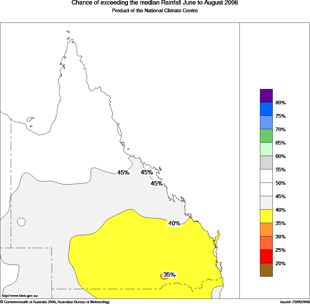 Qld Seasonal Rainfall Outlook: probabilities for Winter 2006, issued 25th May 2006 | |