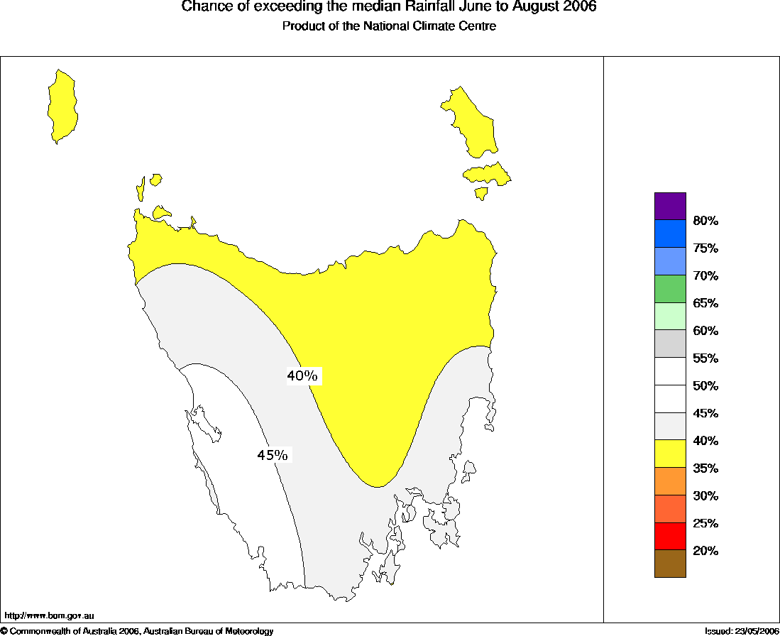 Tas Seasonal Rainfall Outlook: probabilities for Winter 2006, issued 25th May 2006 | |