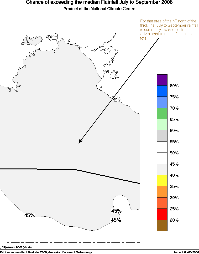NT Seasonal Rainfall Outlook: probabilities for July to September 2006, issued 27th June 2006 | |