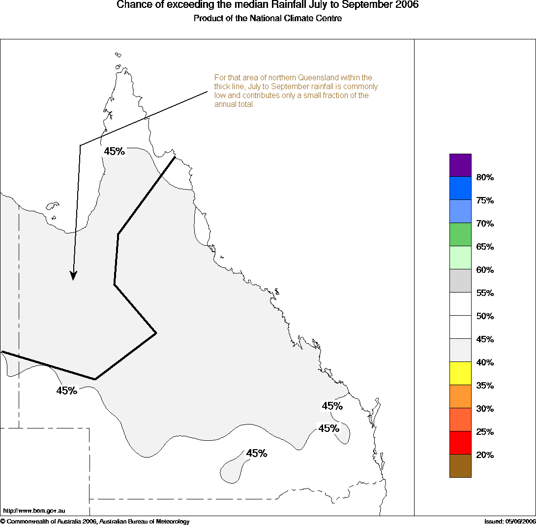 Qld Seasonal Rainfall Outlook: probabilities for July to September 2006, issued 27th June 2006 | |
