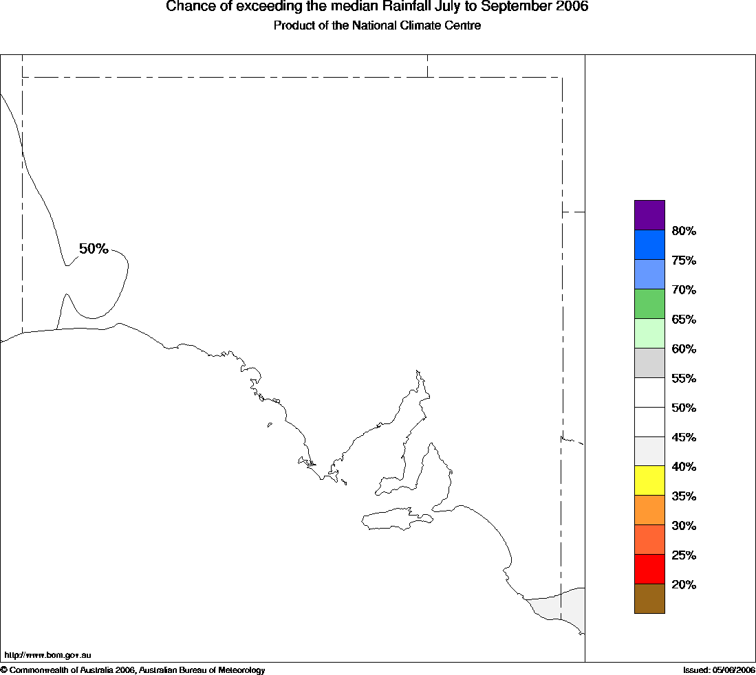 50:50 chances for above average September quarter rainfallThe current seasonal rainfall odds do not strongly favour either wetter or drier than average conditions. Therefore, the chances of accumulating at least median rain during the September quarter (July-September) are close to 50% across South Australia, the Bureau of Meteorology announced today. The pattern of seasonal rainfall odds across Australia is largely a result of above average temperatures in the Pacific Ocean. Conditions in the Indian Ocean are near normal and have had little influence on this outlook. ![]() For the July to September period, the chances of above median rainfall are between 40 and 50% over SA (see map). So in years with ocean patterns like the current, about five September quarters out of 10 are expected to be drier than average over the State, with about five out of ten being wetter. Outlook confidence is related to how consistently the Pacific and Indian Oceans affect Australian rainfall. During July to September, history shows this effect to be moderately consistent across most of central and northern SA, but generally weakly consistent elsewhere in the State (see background information). After moderately positive values of +14 and +15 in March and April respectively, the Southern Oscillation Index (SOI) dropped substantially in May to a value of −10. The approximate SOI for the 30 days ending 24th June is −9. It is likely that neutral ENSO conditions will remain in place for the remainder of 2006. For routine updates and comprehensive discussion on the latest data relating to ENSO, together with details on what the phenomenon is and how it has affected Australia in the past, please see the ENSO Wrap-Up. | |