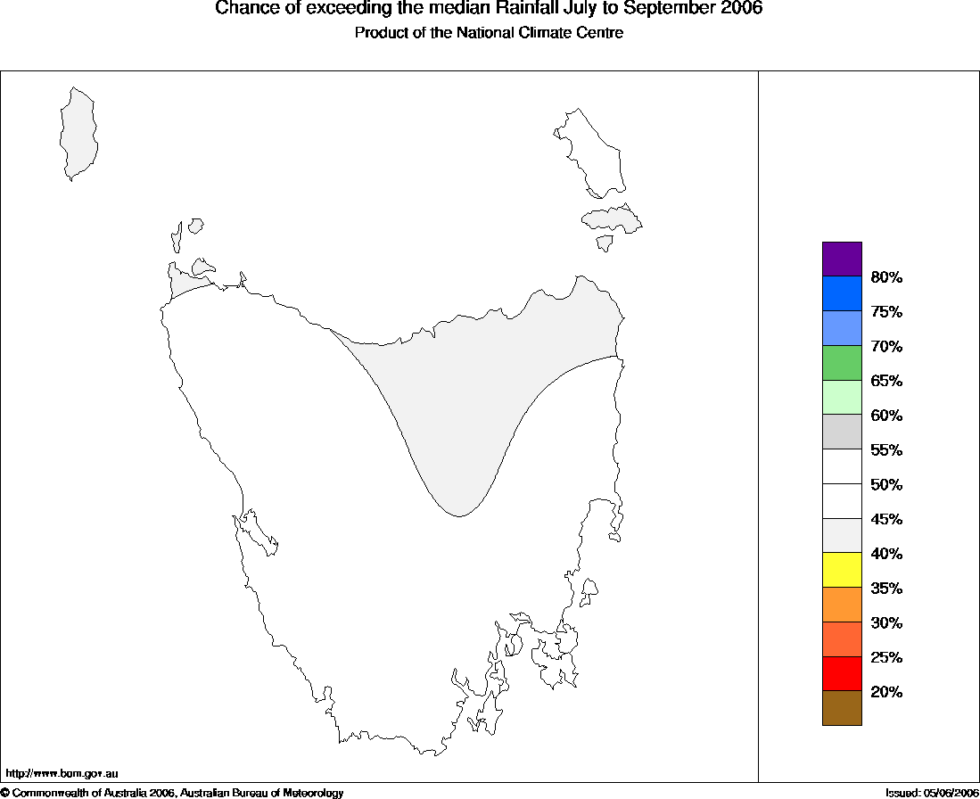 Tas Seasonal Rainfall Outlook: probabilities for July to September 2006, issued 27th June 2006 | |
