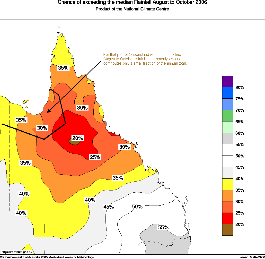 Qld Seasonal Rainfall Outlook: probabilities for August to October 2006, issued 25th July 2006 | |