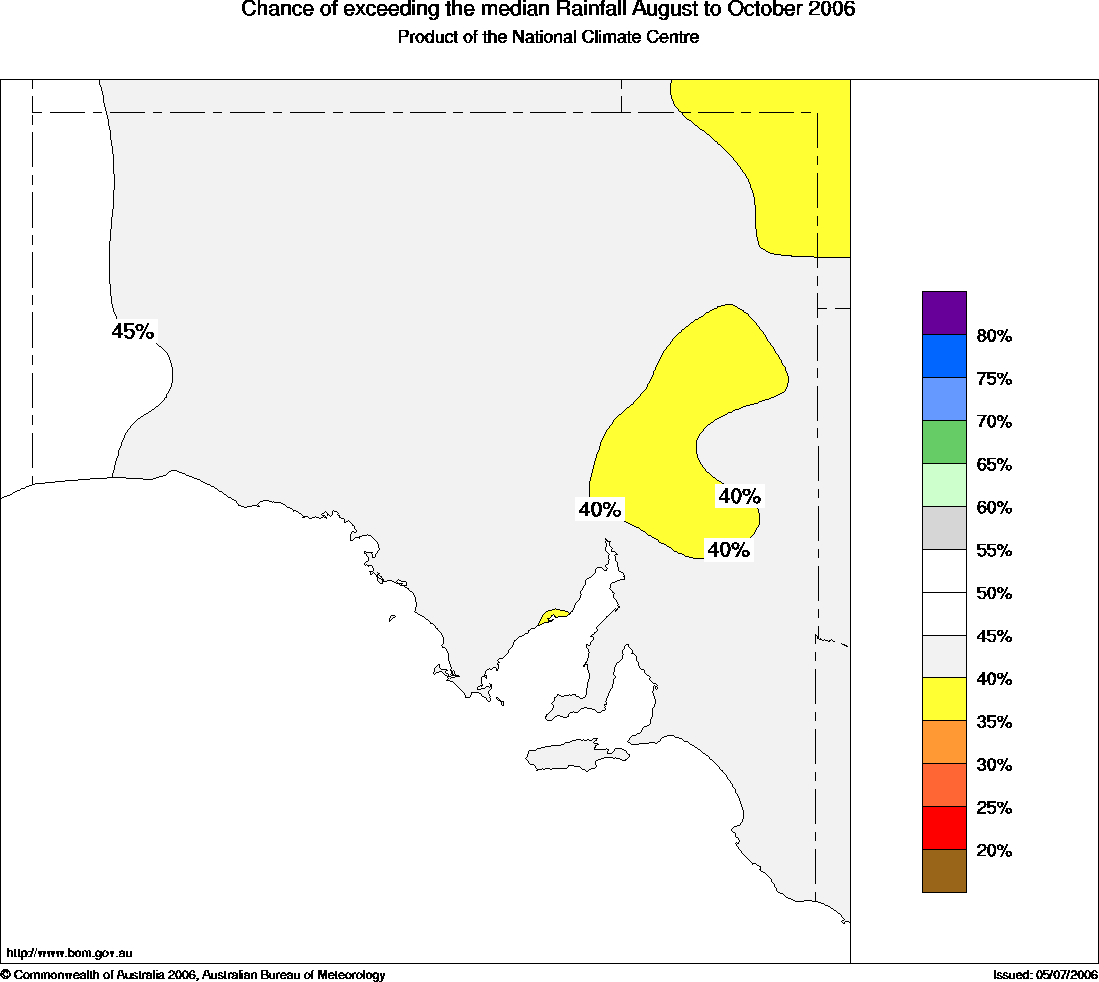 Generally 50:50 chances for above average seasonal rainfallIn general, the current seasonal rainfall odds do not strongly favour either wetter or drier than average conditions across South Australia. The chances of accumulating at least median rain during the late winter to mid-spring period (August-October) are mostly close to 50% across the State, the Bureau of Meteorology announced today. ![]() However, the area to the northeast of Port Augusta and the far northeast corner of the state are two exceptions. For the August to October period in these regions, the chances of above median rainfall are between 35 and 40% (see map). So in years with ocean patterns like the current, about six August to October periods out of 10 are expected to be drier than average in these parts of SA, with about four out of ten being wetter. Outlook confidence is related to how consistently the Pacific and Indian Oceans affect Australian rainfall. During August to October, history shows this effect to be moderately consistent in small patches of northern and southeast SA, but across most of the State it is only weakly or very weakly consistent (see background information). After falling to −10 in May, the Southern Oscillation Index (SOI) rose slightly in June to a value of −6. The approximate SOI for the 30 days ending 22nd July was −9. Although the chances of an El Niño have risen somewhat in the past month, continued neutral ENSO conditions is the most likely outcome for the remainder of 2006. For routine updates and comprehensive discussion on the latest data relating to ENSO, together with details on what the phenomenon is and how it has affected Australia in the past, please see the ENSO Wrap-Up. | |