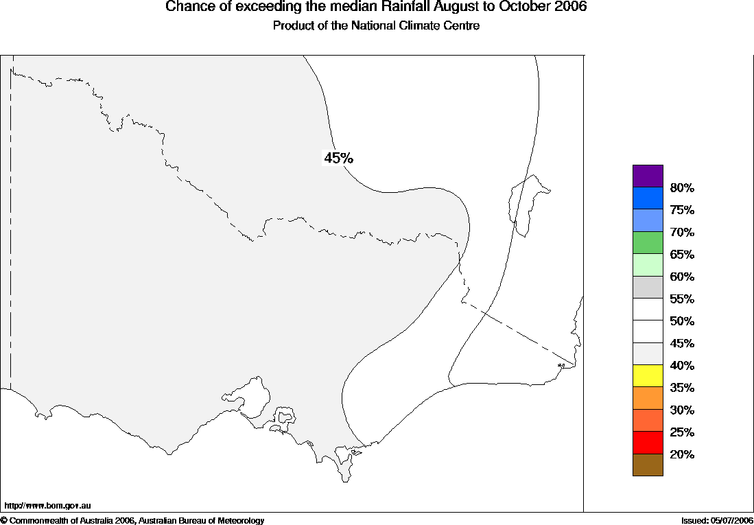 Vic Seasonal Rainfall Outlook: probabilities for August to October 2006, issued 25th July 2006 | |