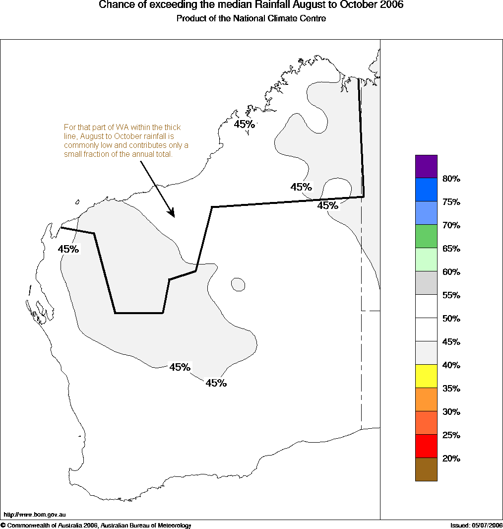 WA Seasonal Rainfall Outlook: probabilities for August to October 2006, issued 25th July 2006 | |
