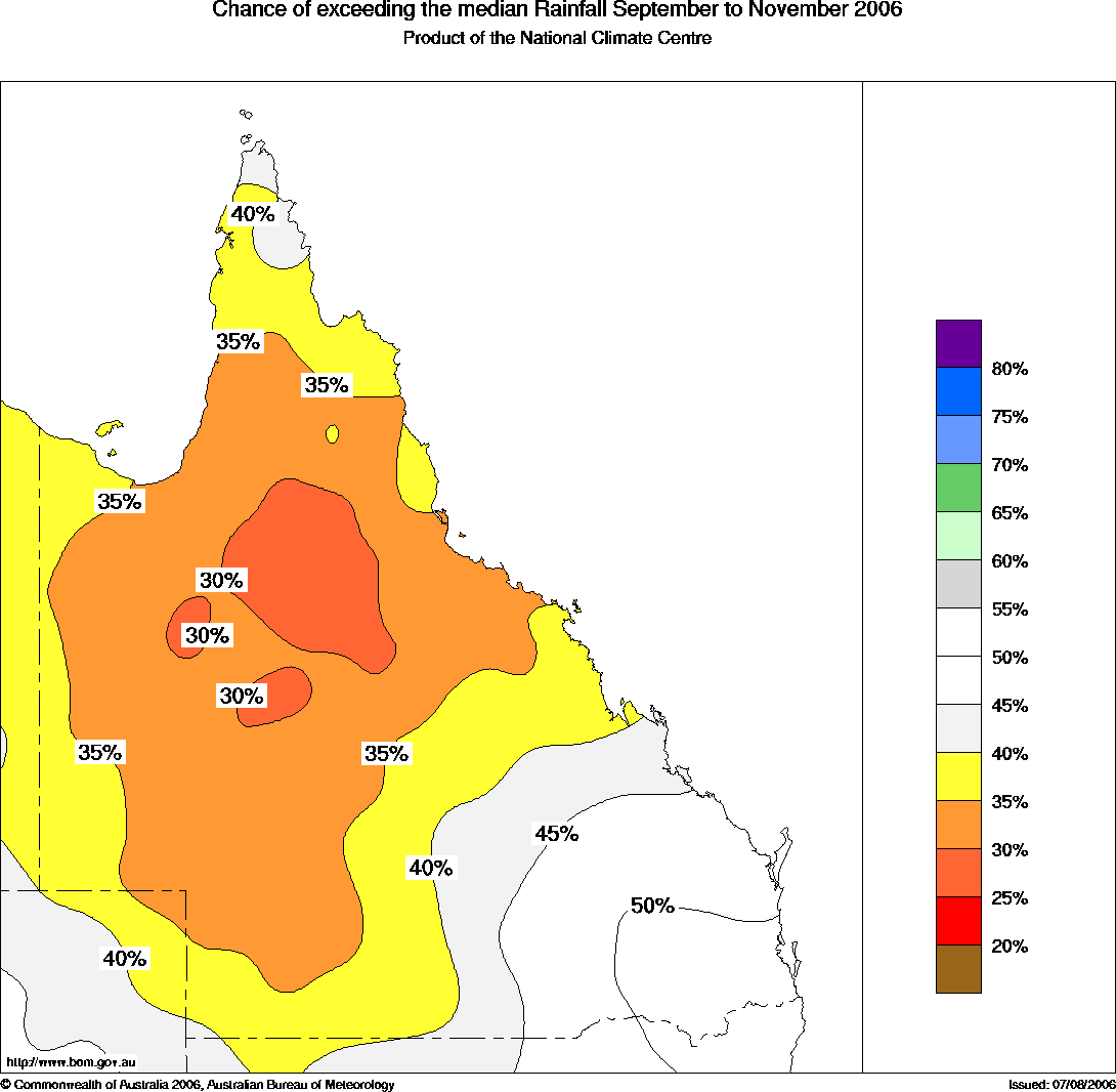 Qld Seasonal Rainfall Outlook: probabilities for Spring 2006, issued 23rd August 2006 | |