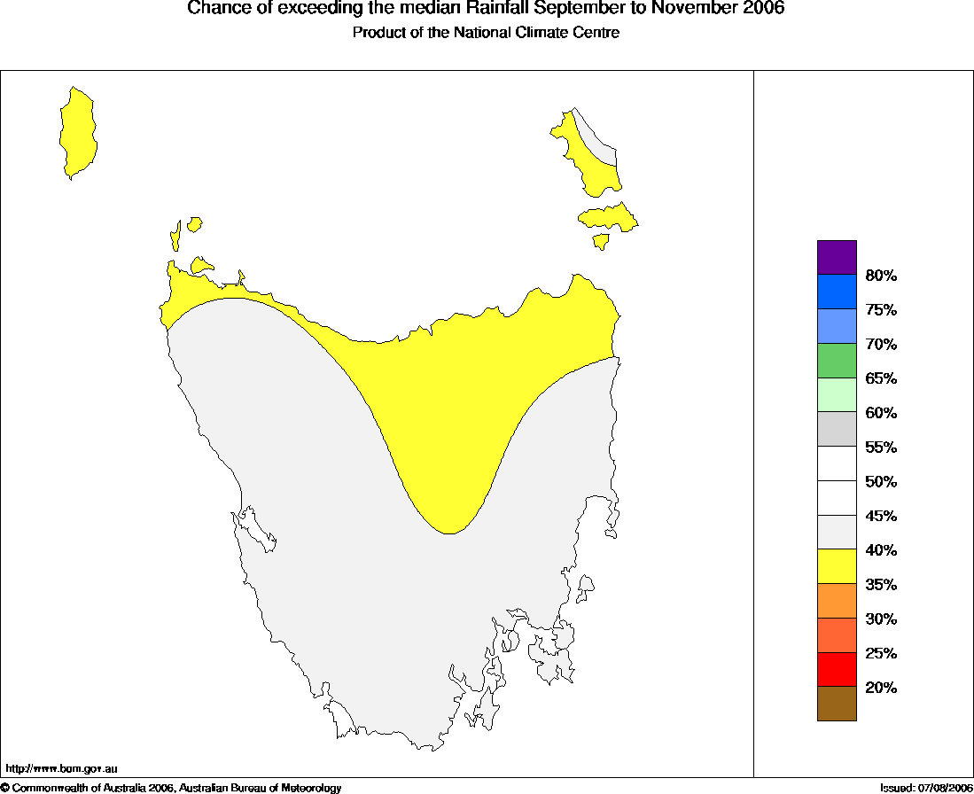 Tas Seasonal Rainfall Outlook: probabilities for Spring 2006, issued 23rd August 2006 | |