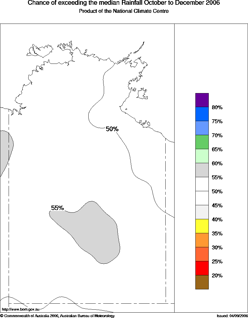 NT Seasonal Rainfall Outlook: probabilities for October to December 2006, issued 26th September 2006 | |