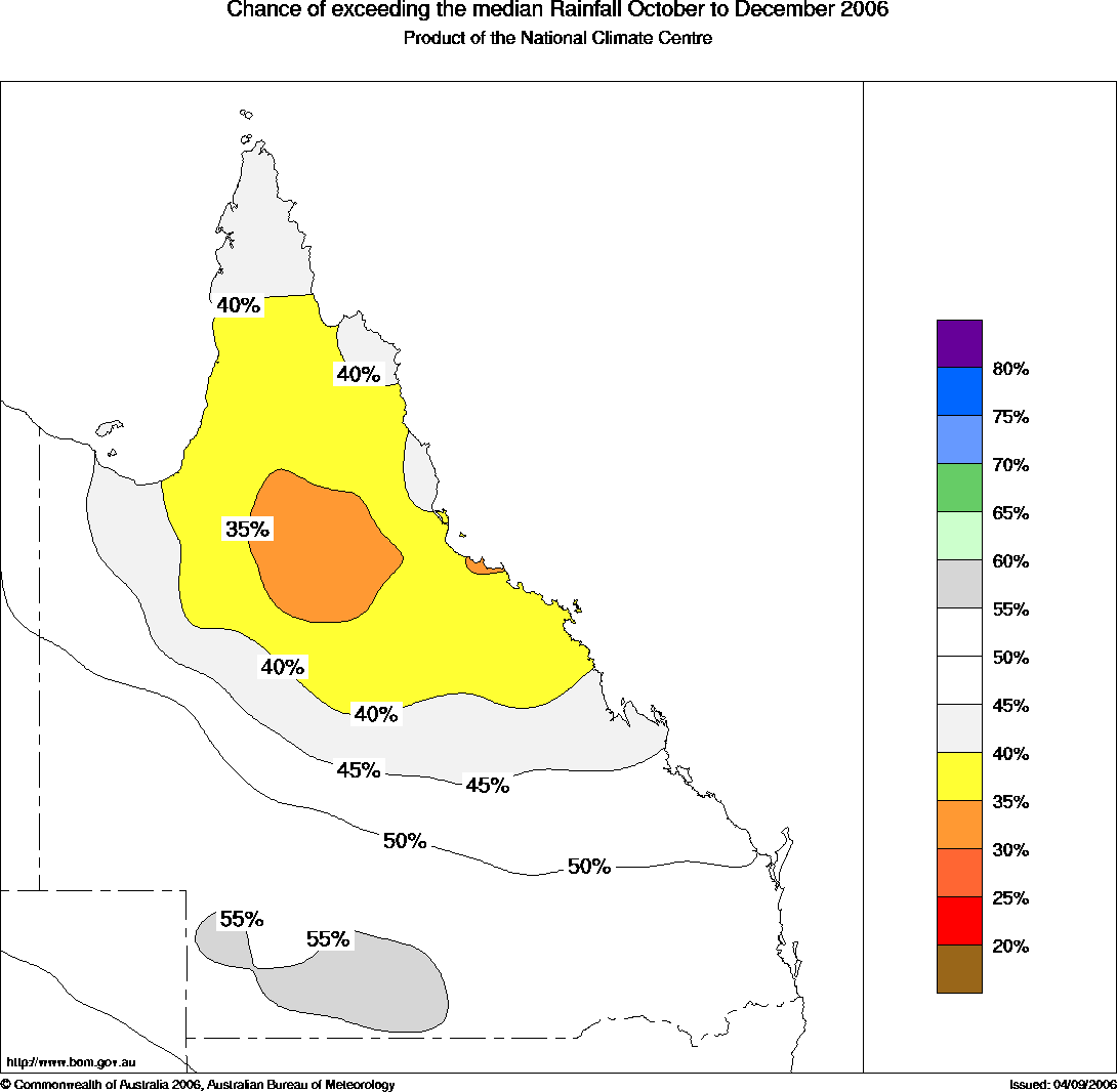 Qld Seasonal Rainfall Outlook: probabilities for October to December 2006, issued 26th September 2006 | |
