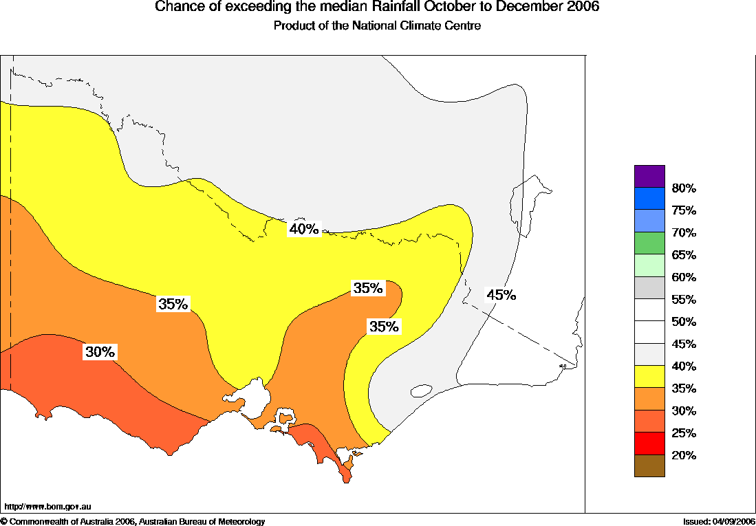 Vic Seasonal Rainfall Outlook: probabilities for October to December 2006, issued 26th September 2006 | |