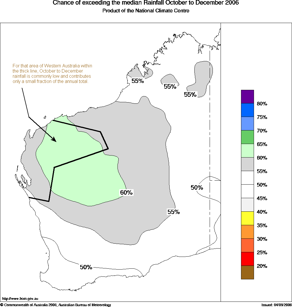 WA Seasonal Rainfall Outlook: probabilities for October to December 2006, issued 26th September 2006 | |
