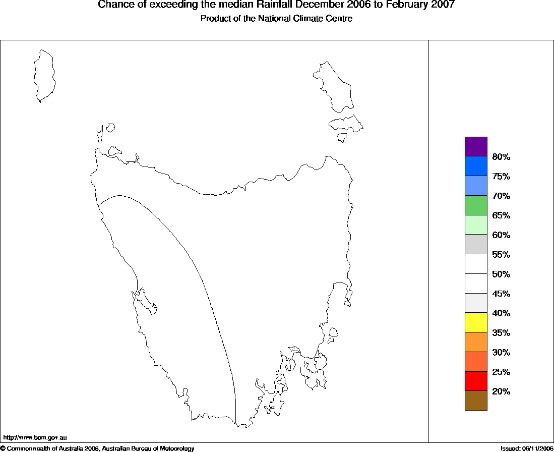 Tas Seasonal Rainfall Outlook: probabilities for Summer 2006/2007, issued 23rd November 2006 | |