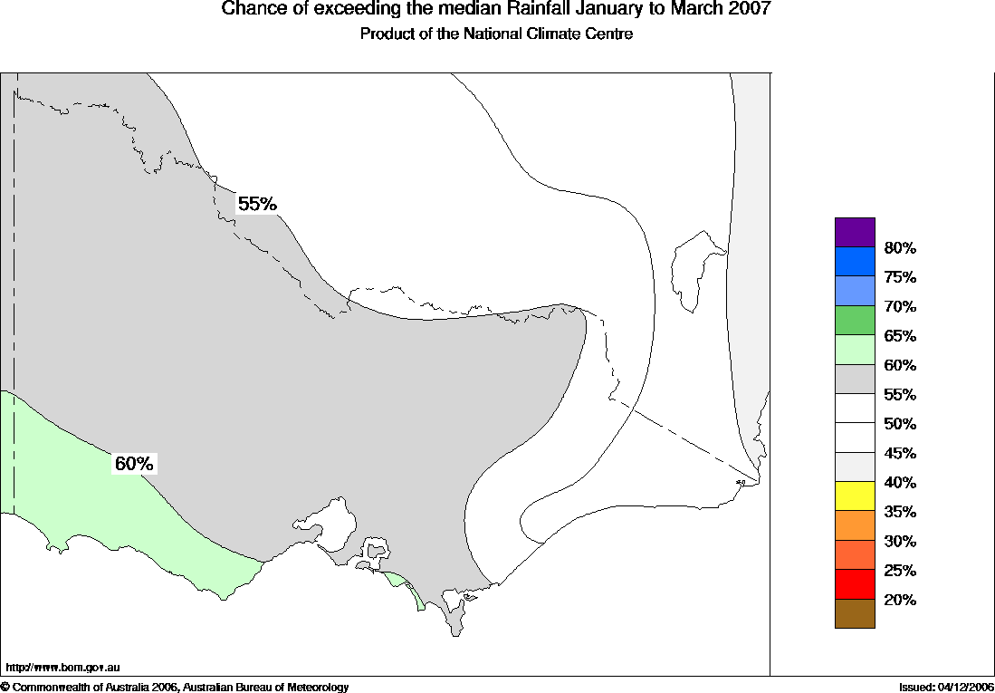 Vic Seasonal Rainfall Outlook: probabilities for January to March 2007, issued 20th December 2006 | |