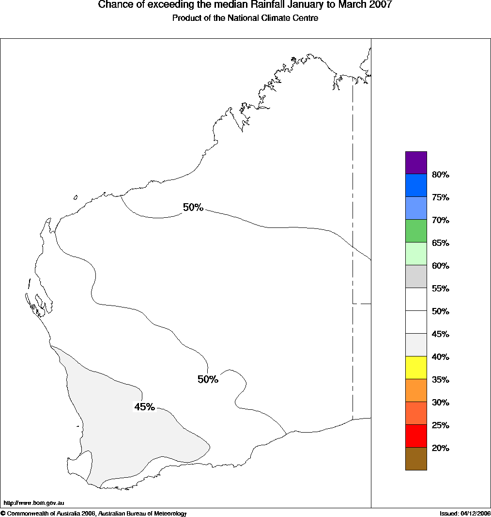 More information on this outlook is available from 9.00am to 5.00pm (WST) Monday to Friday by contacting the Climate and Consultancy section in the Bureau's Perth Office: (08) 9263 2222. | |