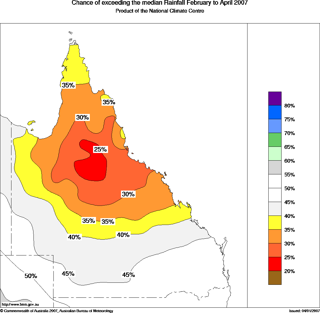 Qld Seasonal Rainfall Outlook: probabilities for February to April 2007, issued 23rd January 2007 | |