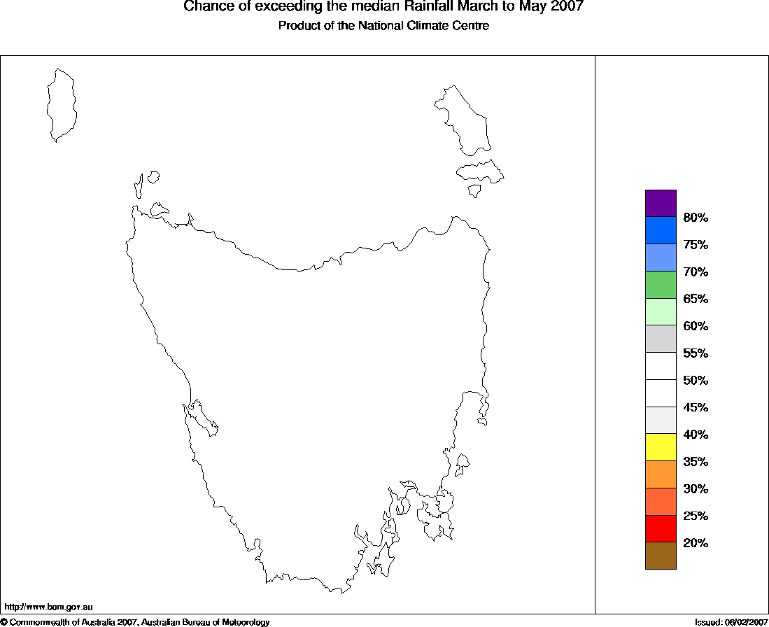 Tas Seasonal Rainfall Outlook: probabilities for Autumn 2007, issued 22nd February 2007 | |