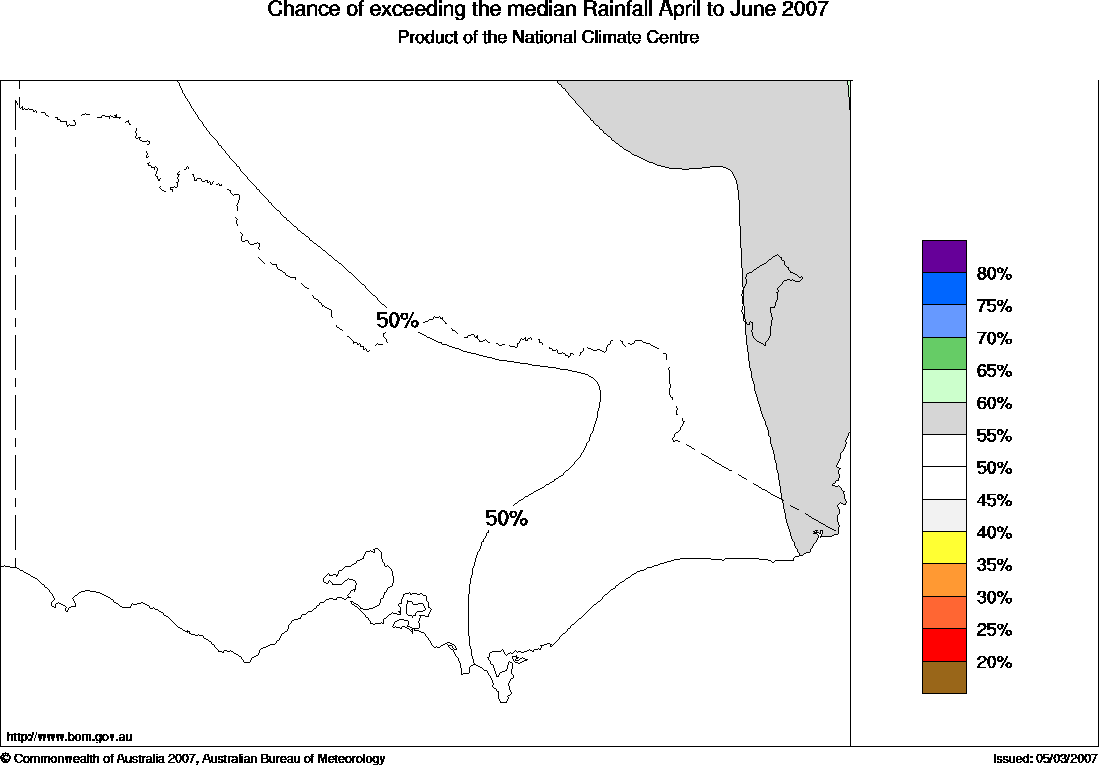 Vic Seasonal Rainfall Outlook: probabilities for April to June 2007, issued 26th March 2007 | |