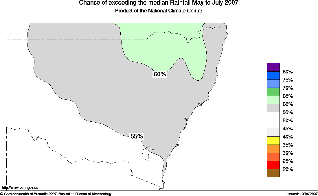 NSW Seasonal Rainfall Outlook: probabilities for May to July 2007, issued 23rd April 2007 | |