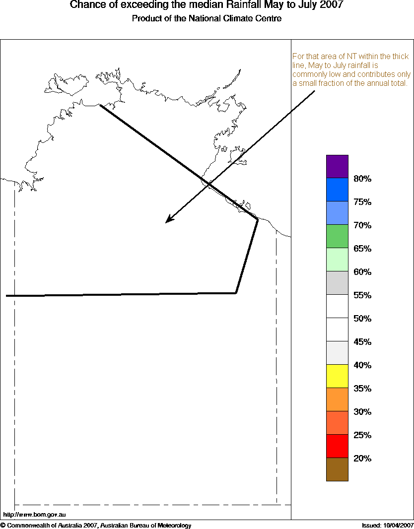 NT Seasonal Rainfall Outlook: probabilities for May to July 2007, issued 23rd April 2007 | |