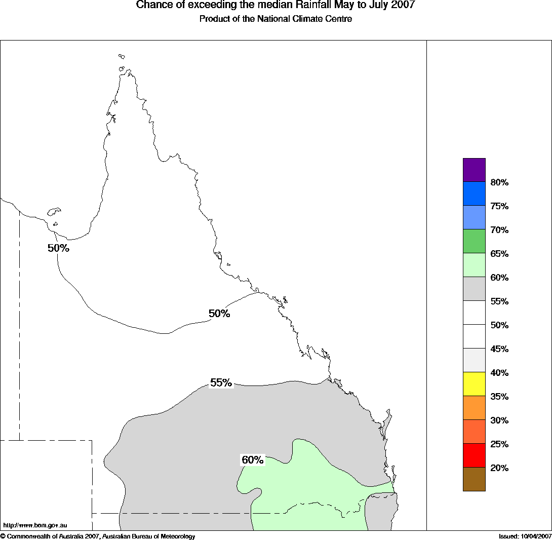 Qld Seasonal Rainfall Outlook: probabilities for May to July 2007, issued 23rd April 2007 | |