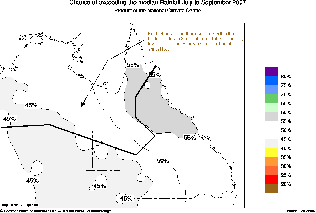 Northern Aust Seasonal Rainfall Outlook: probabilities for July to September 2007, issued 26th June 2007 | |||||